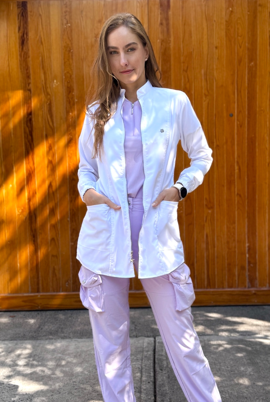 La blusa PISCIS es una prenda súper comoda y versátil. Es de manga corta y cuenta con un cuello alto que puedes ajustar el escote mediante una cremallera. Es un diseño fresco que funciona perfectamente para tus scrubs y para tu día a día.